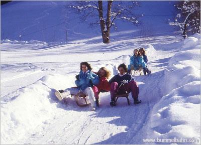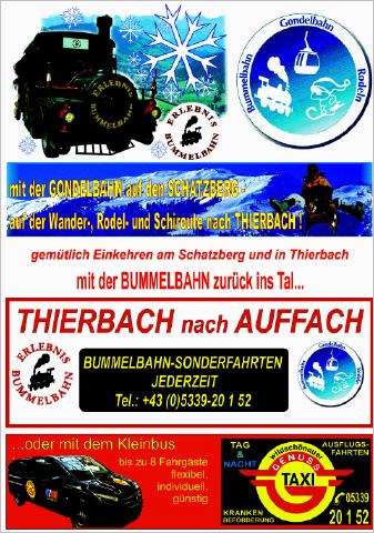 Mit der Schatzberg-Gondelbahn zur Schatzbergalm ( Bergstation). Von dort erleben Sie eine unvergleichliche Rodelfahrt auf dem 7 Km langen Naturweg nach Thierbach. Der Blick über das ganze Tal, bis hin zum Kaisergebirge, bleibt Ihnen unvergessen. Weiter unten geht`s durch den romantischen Wald. Wenn Sie Glück haben, können Sie das Wild bei der Futterkrippe beobachten. Am Ende des Weges erwartet Sie das urige Bergdörfchen Thierbach. Zeit zum Einkehren wird wohl allemal sein, bevor es mit der Bummelbahn zurück in`s Tal geht.